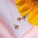 Add a splash of fun and magical drizzles to your jewelry collection with our "Amusing Umbrella Pendant Set". Featuring a charming umbrella motif, crafted from polished silver and adorned with colorful enamel accents, this pendant, with its umbrella-shaped design, adds a touch of cheer to any outfit, while the matching earrings complement the pendant with their playful elegance.